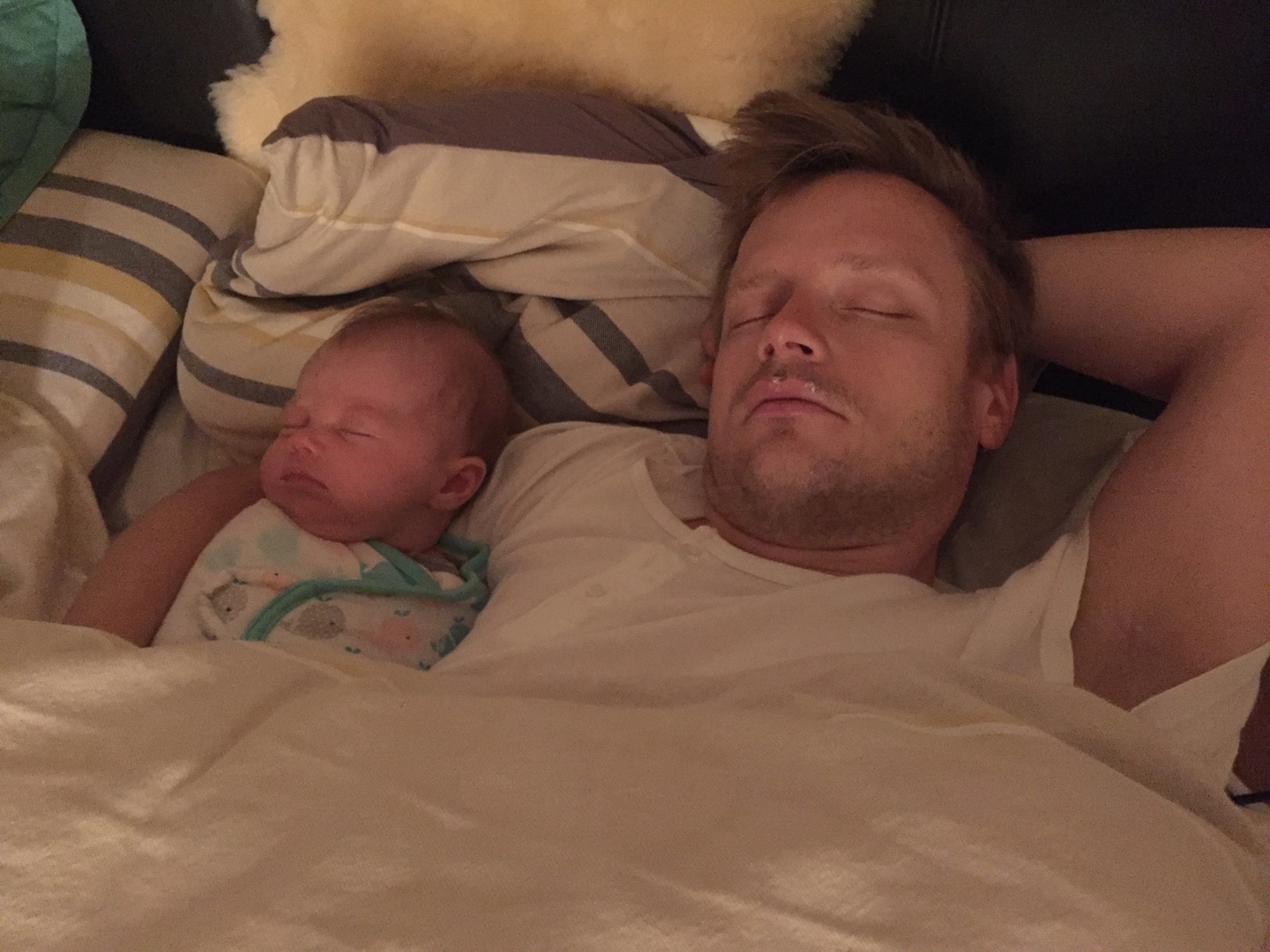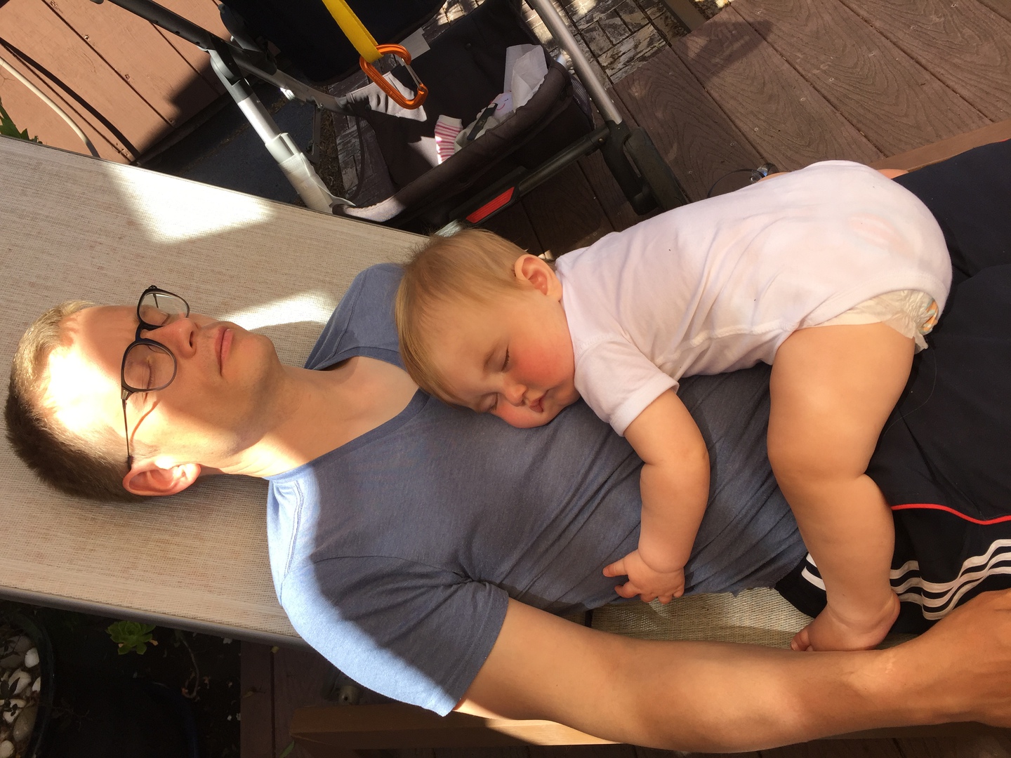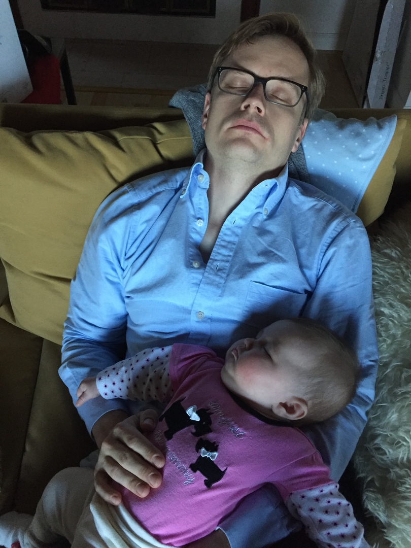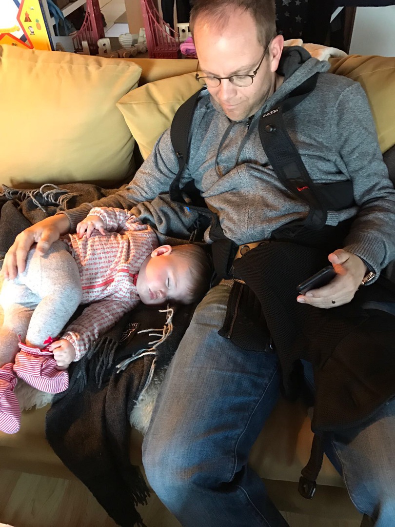 I have a new strategy which results in a win-win situation for my Papas and me. I try to minimize the amount of sleep at night by decreasing the amount of food consuming per feeding and increasing the frequency of my feedings. With this, I can sleep through the day and my Papas can do their stuff, whatever they need to do. Plus, on top of it, they get to carry me around all night long which is strenghtening their muscles and they can skip the gym and safe money. Whoo hoo. As you can see in the pic, it works: Total relaxation through my new strategy. Just wondering why they look like zombies these days....